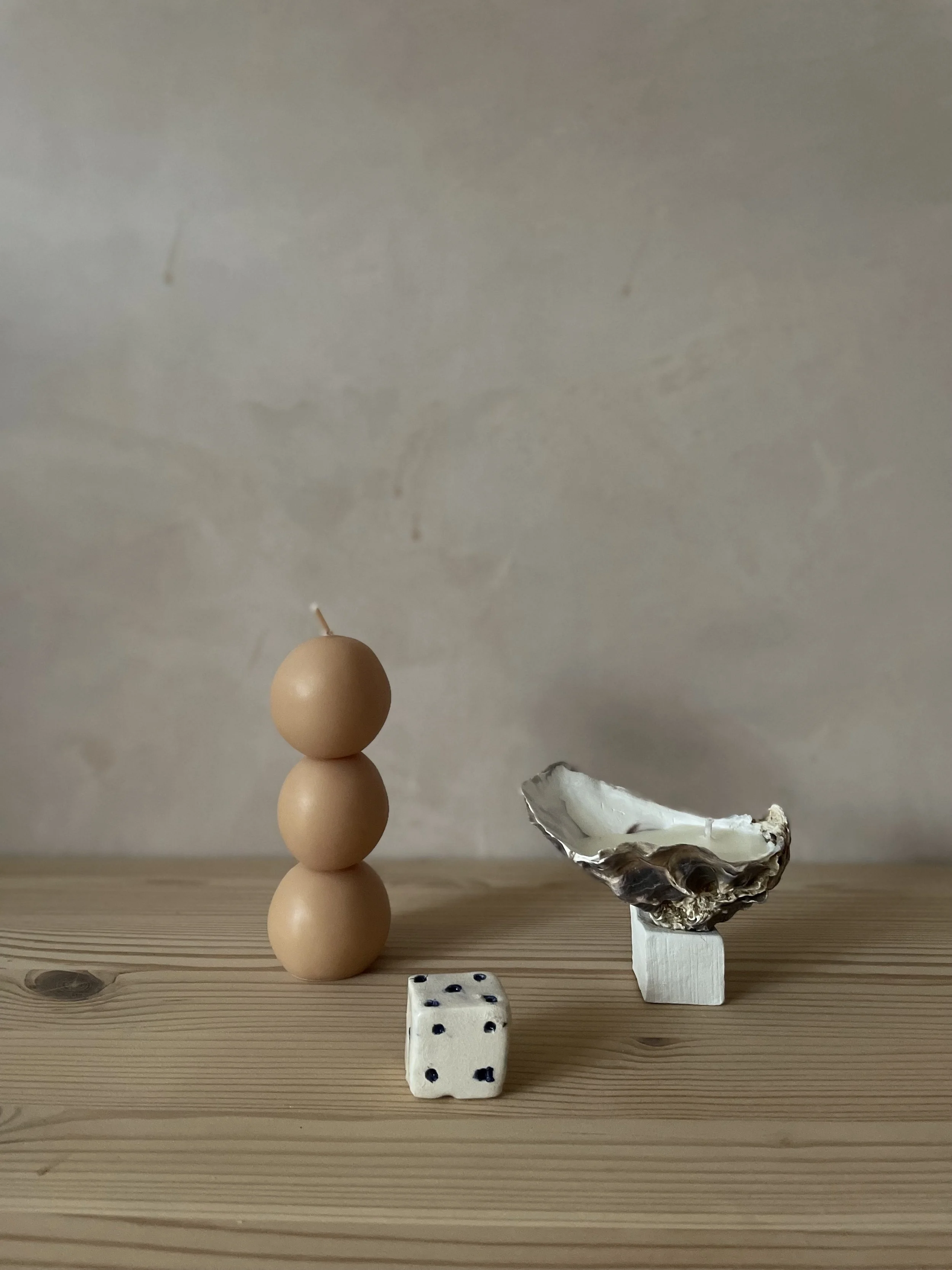 A chic combo of an Ann Vincent sculptural candle, August Clay Plinth Oyster Candle and a Mercedes ceramic dice and wrapped beautifully together in a August gift box tied with our signature orange cotton string.